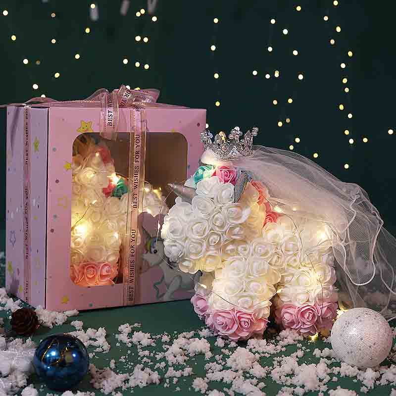 Um die Platzanforderungen verschiedener Szenarien zu erfüllen, bietet Rose Unicorn den Kunden zwei Mainstream -Größen. Das 25-cm-Modell ist exquisit und schick, geeignet als Tischzentrum, Desserttischverzierung oder auffälliges Zubehör für Souvenirs, Licht und flexibel. Das 40 -cm -Modell ist voller Dynamik und eine ideale Wahl für die Erstellung eines Photo -Hintergrundwandfokus, ein visuelles Zentrum am Eingangs Welcome oder eine Hauptbühnendekoration mit einem stärkeren Gefühl der Präsenz. Beide Spezifikationen behalten die gleiche exquisite Handwerkskunst und die dauerhaften Eigenschaften von PE -Rosen bei.