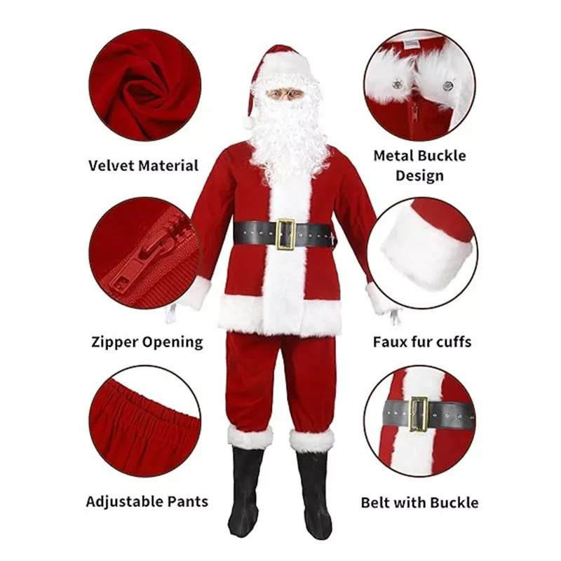 Dieses Kostüm des Weihnachtsmanns ist aus weichem, bequemem Polyesterstoff und bietet hervorragende Atmungsaktivität und Wärme, um Wärme und Komfort während der Winteraktivitäten zu gewährleisten. Das Design des Kostüms behält das klassische rot -weiße Farbschema bei, das von flauschigen weißen Säumen und einem schwarzen Gürtel akzentuiert wird und einen auffälligen visuellen Einfluss mit komplizierten Details erzeugt. Das Kostüm wird auch mit einem passenden Hut und Bart ausgestattet, sodass es ohne zusätzliche Zubehör leicht zu tragen ist.